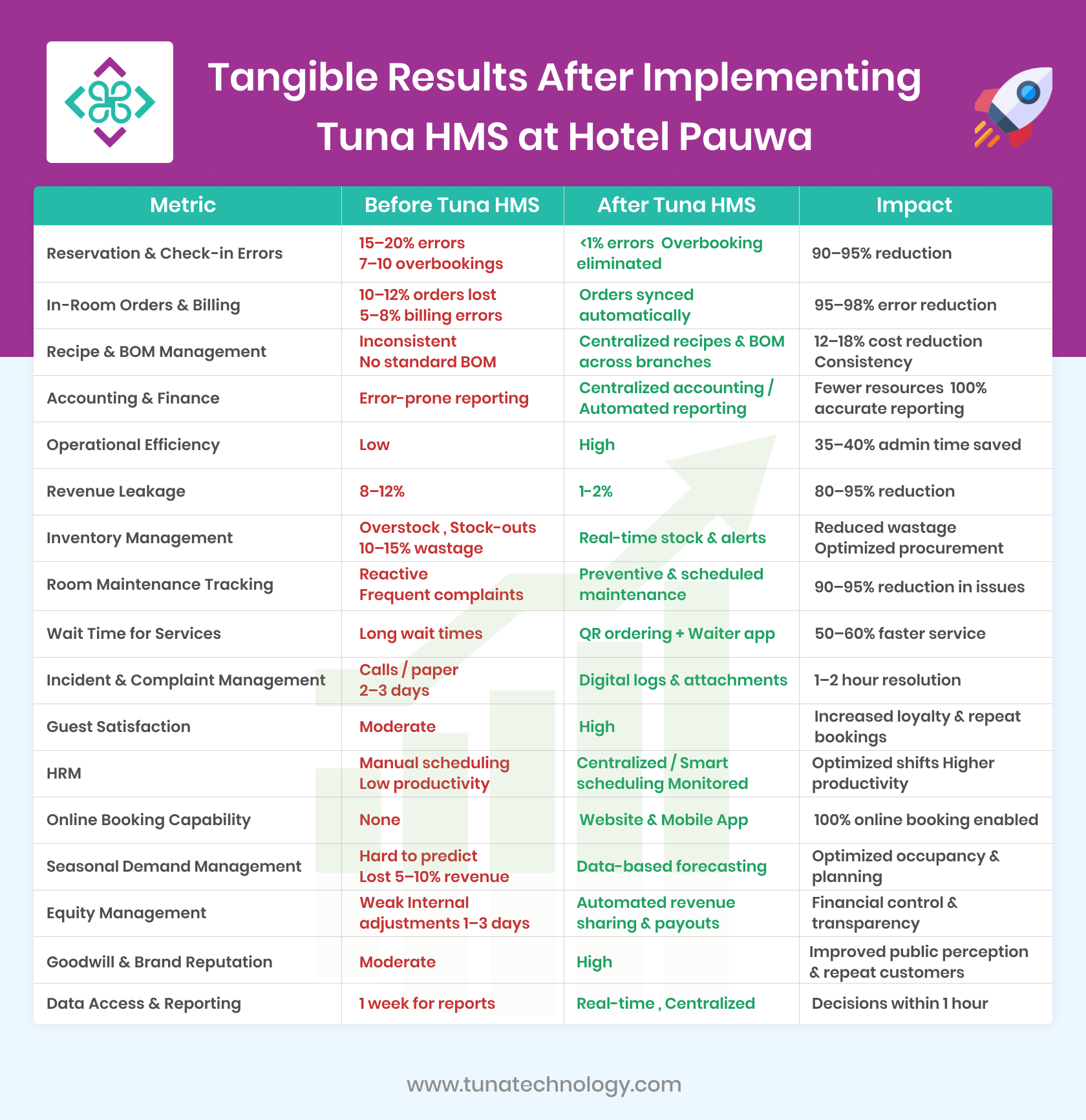 Prior to the implementation of Tuna HMS, Hotel Pauwa was experiencing serious operational, financial and guest service problem in its branches:
